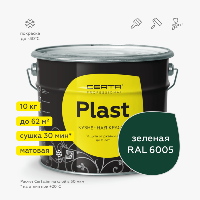 Матовая эмаль Церта-Пласт — профессиональная кузнечная краска для художественной ковки, проката, штамповки и литья. Возможно нанесение на камень, бетон, песчано-бетонные конструкции, оцинкованный и цветной металл. Рекомендована мастерами Союза кузнецов России, Московского союза кузнецов-художников и кузнечного форума kovka.guru.